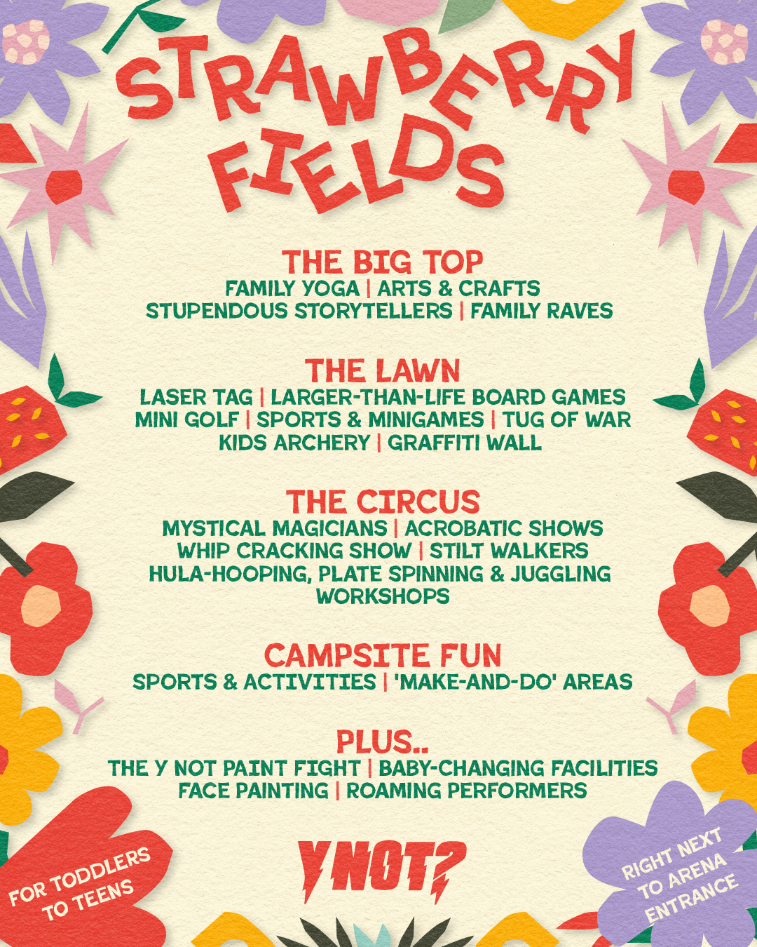 Bring your little Y Notters to Strawberry Fields, our dedicated Kids Area, packed with free activities and facilities all weekend! Kids of all ages can enjoy arts and crafts, performances, story-telling, circus skills, kids raves, and workshops for the whole family.